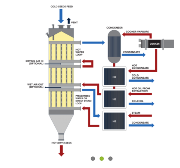 Oilseeds flow downward across a series of plate banks, while the heat recovery medium or steam flows in between welded plates to achieve the targeted heating. In the drying section: hot air moves vertically to remove moisture. Processing plants should expect an increase thermal performance due to the increased heat transfer area density than conventional technologies.