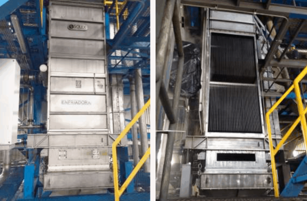 Due to the high relative humidity in this part of South America, the decision was made to inject a small amount of air from a blower into the equipment to help remove the moisture that migrates during the cooling process and ensures proper flow of sugar between the plates. This blower only demanded a fraction of the energy that would be necessary for a rotating drum or fluidized bed cooling system.