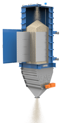 Without air: The pellets enter a tower-like design and slowly pass between a parallel series of heat exchanger plates that contain a counter-current flow of water or other heat transfer fluid. Heat transfers from the pellets to the heat transfer fluid via a steel plate wall. The product then cools to temperatures between 3 to 5°C above ambient temperatures as, pulled by gravity, it slowly and uniformly moves downward, controlled by a discharge feeder.
